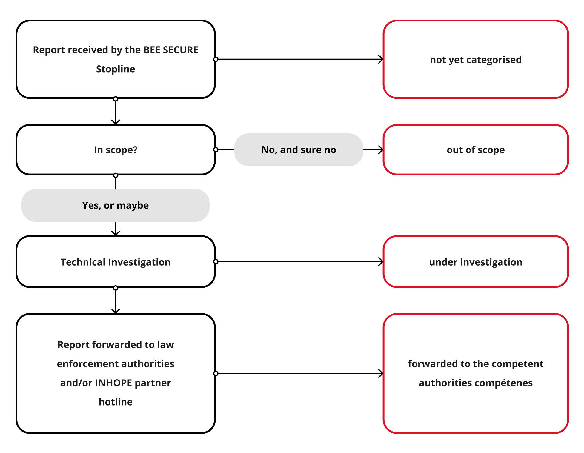 BEE SECURE Stopline will not, however, deal with cases involving personal incidents such as personal insults, harassment, commercial abuse, false information (hoaxes), etc., in order to guarantee uniform, clear and transparent management of the reports received.